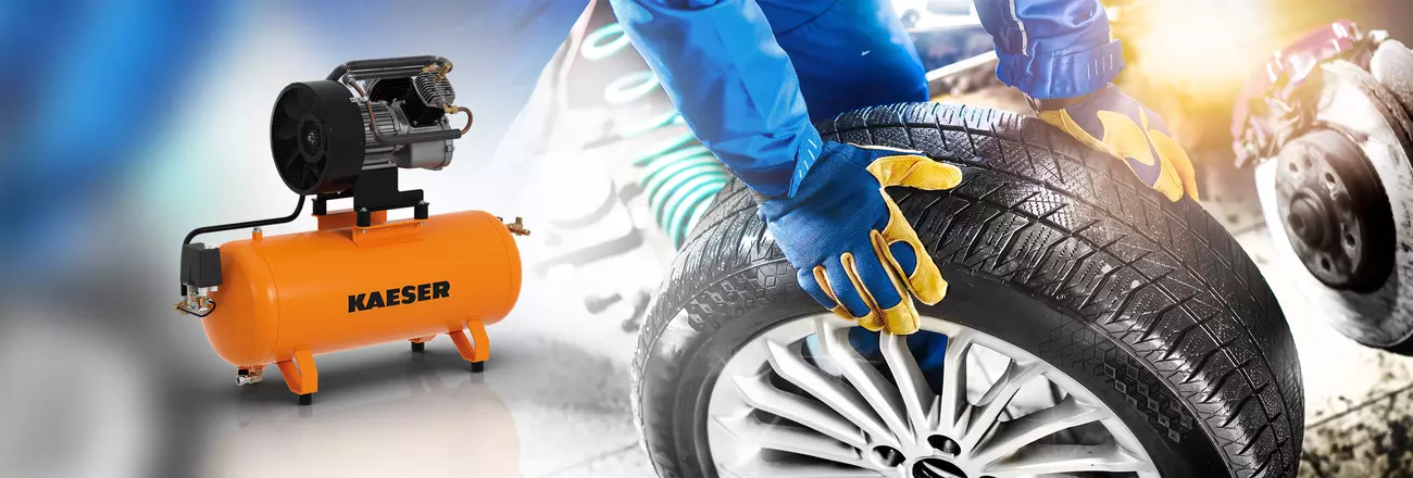 Stationary EUROCOMP (EPC) reciprocating compressors from KAESER are particularly successful in automotive and tyre service workshops. The choice of horizontal, vertical or free-standing air receivers means these powerful all-rounders can be installed in any location, even in the smallest of workshops.