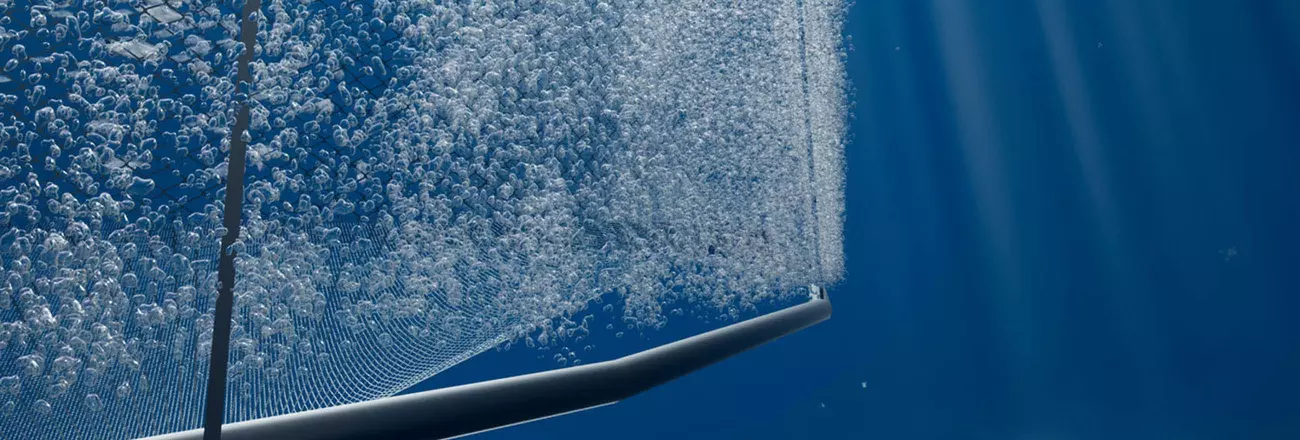 A bubble curtain typically consists of a diffuser hose which is arranged in a ring around a farm at its lowest point. When a threat is detected, a steady flow of compressed air is pumped through the diffuser hose, releasing small, uniform air bubbles. As these air bubbles rise through the water, they create a continuous physical barrier (curtain), preventing jellyfish and algae blooms which are drifting with the current, from entering the net pens. The ocean current then drives the threat alongside the bubble curtain until it passes the farm.