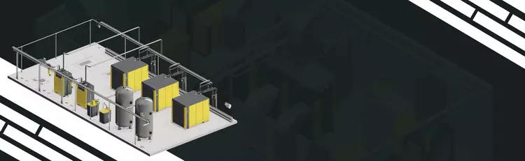 To stadium projektowania, na którym już po zamówieniu urządzeń tworzymy wizualizację orurowania wszystkich elementów stacji sprężonego powietrza. Dzięki temu widać poszczególne elementy, ich długość oraz średnice. Graficzne przedstawienie orurowania stacji jest ważne dla firmy instalującej. Dzięki niemu będzie wiedziała, jak powinny być wykonane rurociągi sprężonego powietrza i kondensatu. Istotne jest, aby uwzględnić wszystkie przyłącza, przestrzenie serwisowe, odpowiednie umiejscowienie zaworów. Należy pamiętać o właściwych spadkach ciśnienia oraz izolacji termicznej rurociągów. Jest to moment, w którym odwzorowujemy schemat technologiczny P&ID. Tego typu wizualizacje pokazują również kierunki przepływu w poszczególnych przewodach. Jest to wymagana informacja szczególnie w przypadku urządzeń chłodzonych wodą.